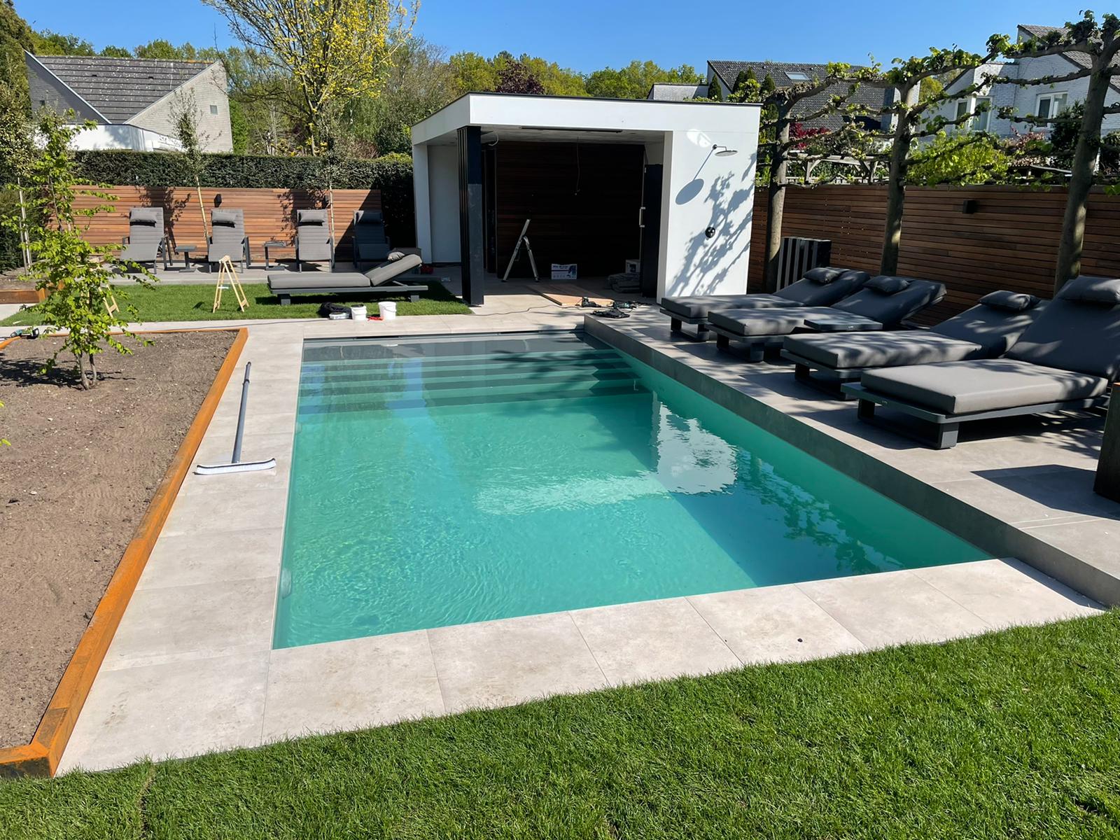 Een bouwkundig bad wordt altijd afgewerkt met een rand tegels aan de bovenkant. Vaak wordt er ook een stuk terras aangelegd. Je wilt natuurlijk wel je bedje dicht aan het zwembad kunnen zetten. Het terras wordt aangelegd door tegelzetters uit ons eigen netwerk die écht vakwerk leveren.